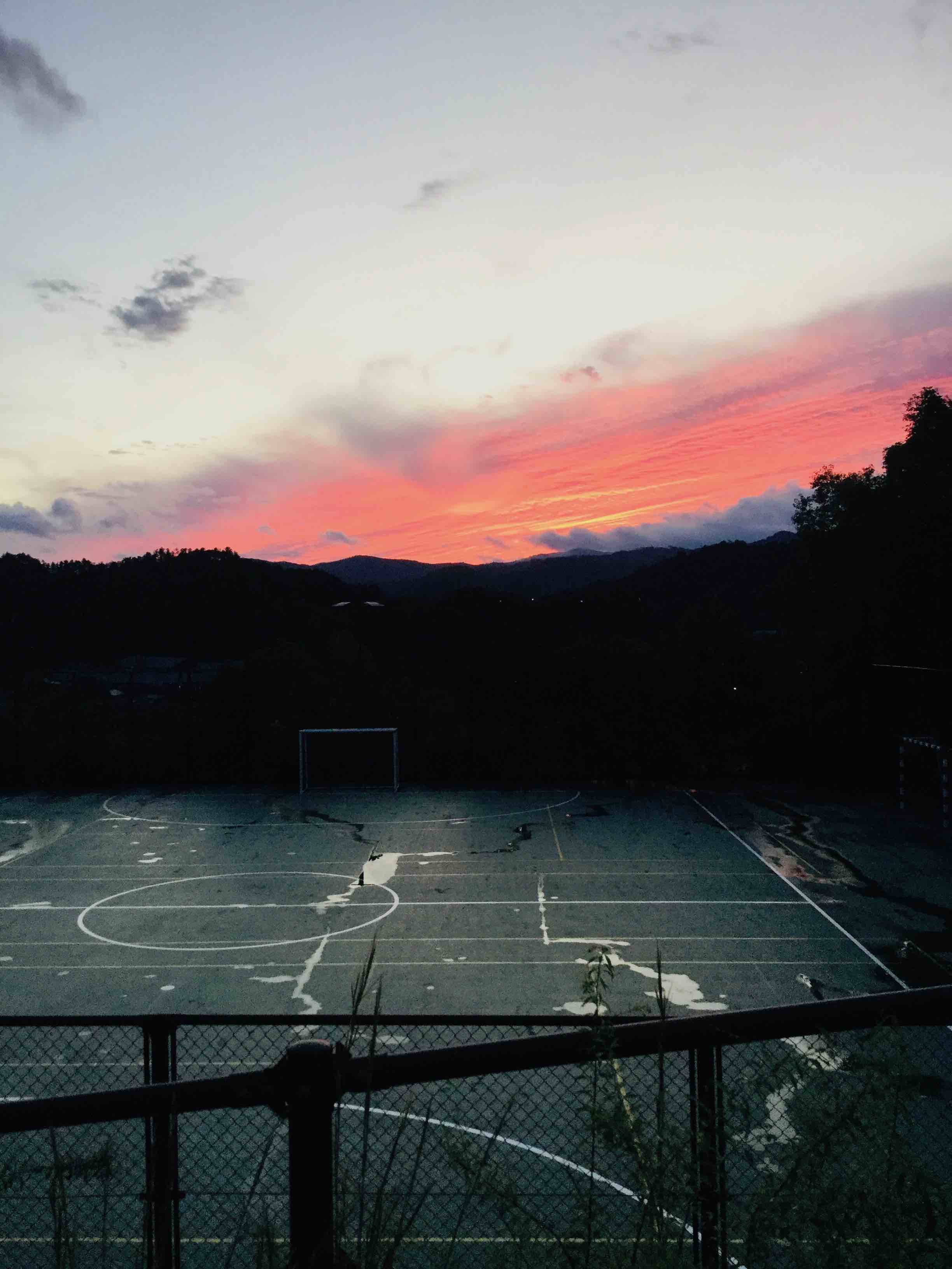 10/8(火)の小松ゼミの実習の帰り、学内の運動場付近から見た夕日は、神懸かっていた!