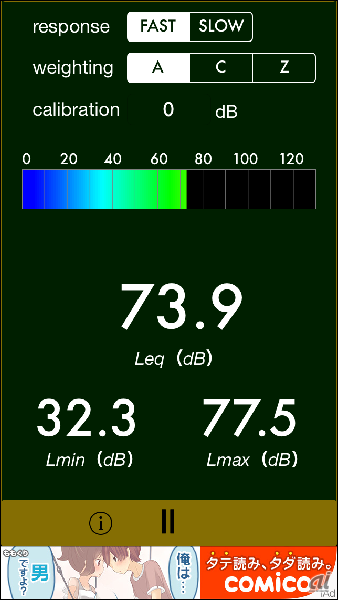 無料版だと測定時間が20秒という制限はあるが、最大値、最小値、平均値、そしてLAeq(等価騒音レベル)まで計測できる。まるで自分の体温を測るかのように、周囲の音の物理量を、手持ちにスマホで計測できるのだ。