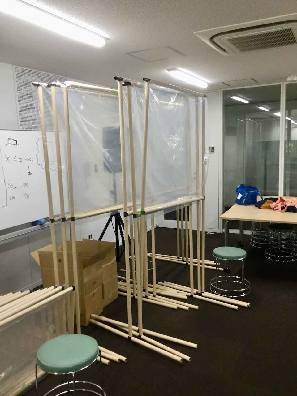 特にボイトレや対面実習が行われる特殊環境にあるので、飛沫防止には最新の注意を払っています。まずは机同士を間隔を開けて並べた上に、紙管とビニルで作成したパーテーションを設置予定。